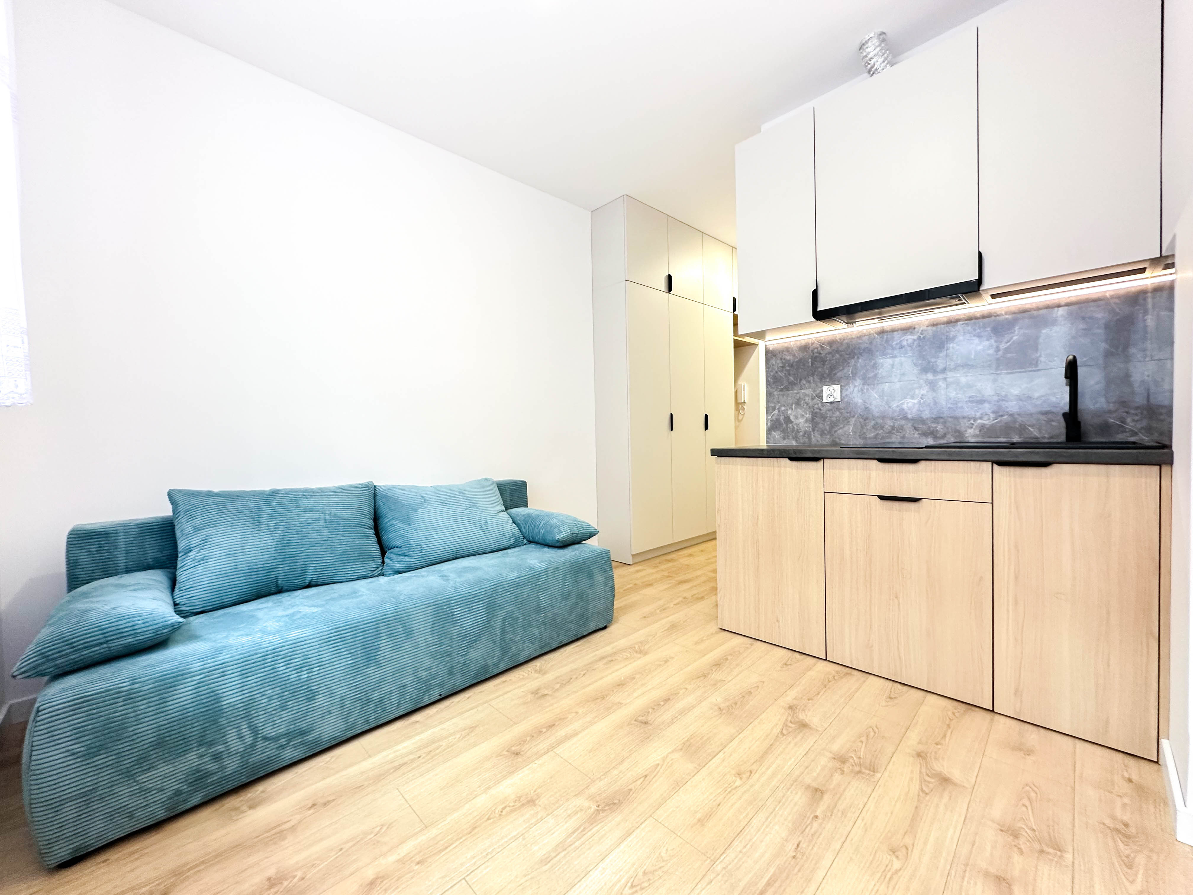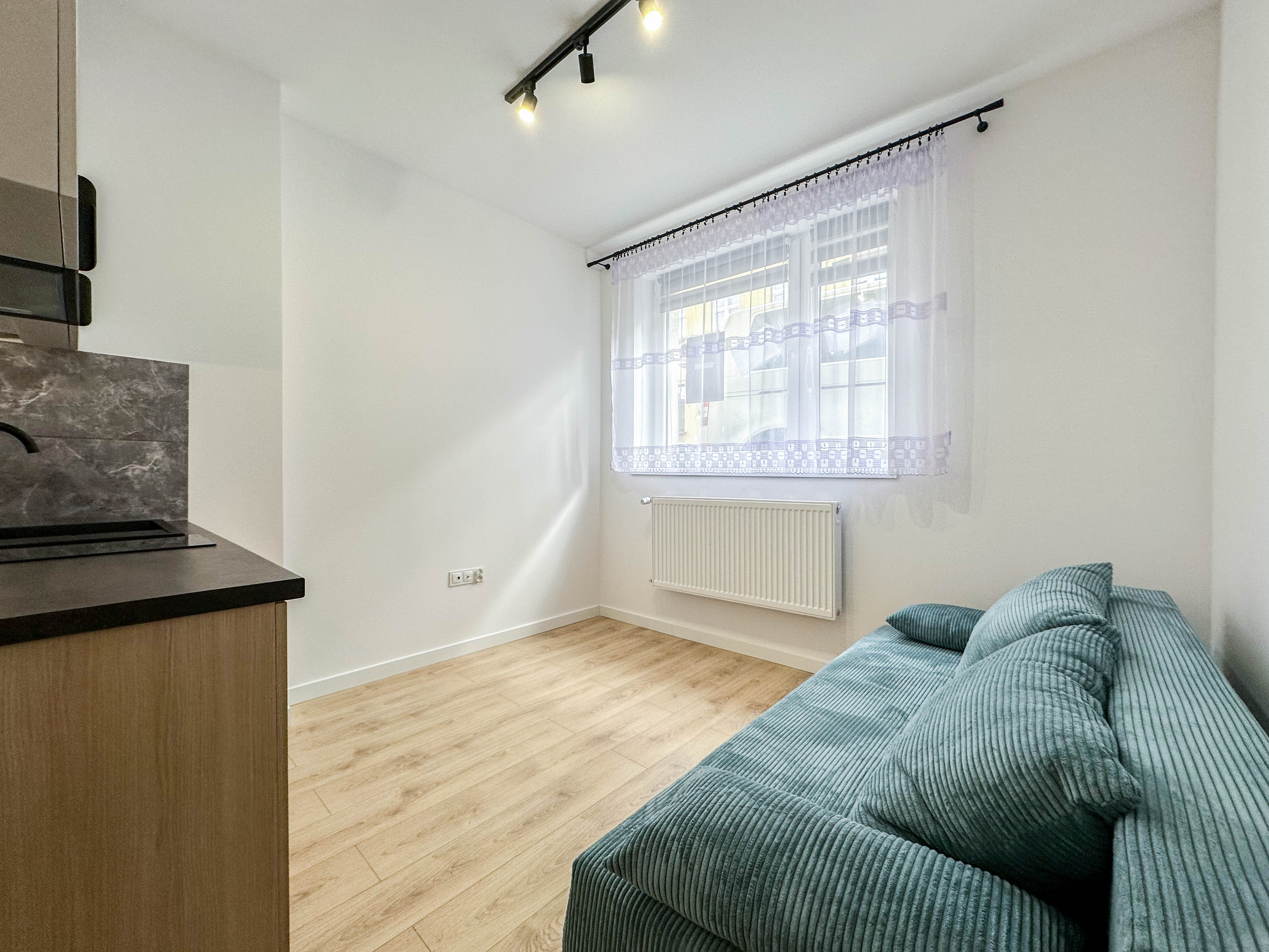 Mieszkanie nowe w pełni umeblowane i wyposażone. W salonie rozkładana sofa, stolik kawowy. Aneks kuchenny z płytą grzewczą, lodówką, szafkami. W przedpokoju duża szafa. Łazienka z prysznicem toaletą lustrem oraz z szafkami. Mieszkanie mieści się na poziomie -1 budynku po remoncie. Do mieszkania przynależy miejsce postojowe przed budynkiem płatne dodatkowo 200zł